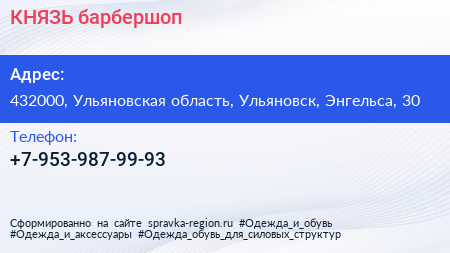 КНЯЗЬ, барбершоп по адресу 432000, Ульяновская область, Ульяновск, Энгельса, 30 в дальнейшем Организация, размещена в следующих категориях:
