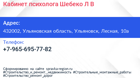 Кабинет психолога Шебеко Л.В. по адресу 432002, Ульяновская область, Ульяновск, Лесная, 10а в дальнейшем Организация, размещена в следующих категориях:
