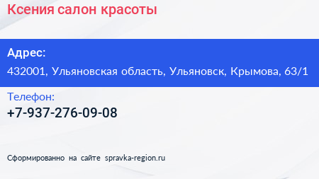 Ксения, салон красоты по адресу 432001, Ульяновская область, Ульяновск, Крымова, 63/1 в дальнейшем Организация, размещена в следующих категориях: