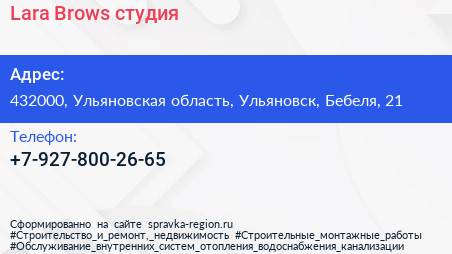 Lara Brows, студия по адресу 432000, Ульяновская область, Ульяновск, Бебеля, 21 в дальнейшем Организация, размещена в следующих категориях: