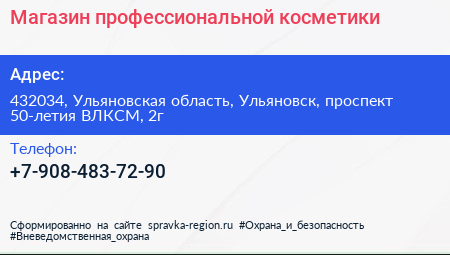 Магазин профессиональной косметики по адресу 432034, Ульяновская область, Ульяновск, проспект 50-летия ВЛКСМ, 2г в дальнейшем Организация, размещена в следующих категориях: