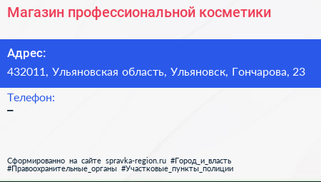Магазин профессиональной косметики по адресу 432011, Ульяновская область, Ульяновск, Гончарова, 23 в дальнейшем Организация, размещена в следующих категориях: