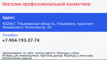 Магазин профессиональной косметики по адресу 432067, Ульяновская область, Ульяновск, проспект Ленинского Комсомола, 43 в дальнейшем Организация, размещена в следующих категориях: