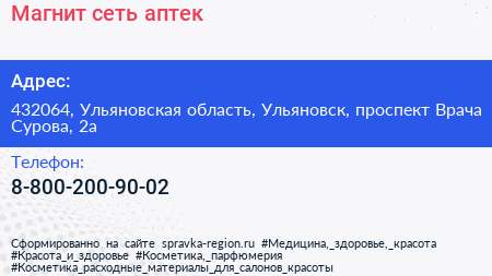 Магнит, сеть аптек по адресу 432064, Ульяновская область, Ульяновск, проспект Врача Сурова, 2а в дальнейшем Организация, размещена в следующих категориях: