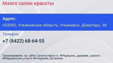 Манго, салон красоты по адресу 432042, Ульяновская область, Ульяновск, Доватора, 18 в дальнейшем Организация, размещена в следующих категориях: