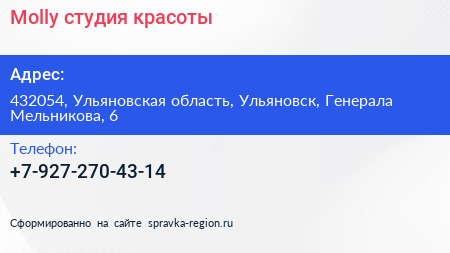 Molly, студия красоты по адресу 432054, Ульяновская область, Ульяновск, Генерала Мельникова, 6 в дальнейшем Организация, размещена в следующих категориях: