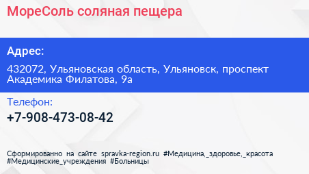МореСоль, соляная пещера по адресу 432072, Ульяновская область, Ульяновск, проспект Академика Филатова, 9а в дальнейшем Организация, размещена в следующих категориях:
