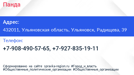 Панда по адресу 432011, Ульяновская область, Ульяновск, Радищева, 39 в дальнейшем Организация, размещена в следующих категориях: