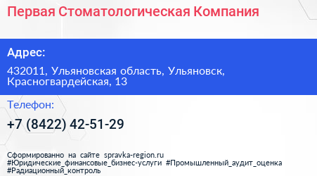 Первая Стоматологическая Компания по адресу 432011, Ульяновская область, Ульяновск, Красногвардейская, 13 в дальнейшем Организация, размещена в следующих категориях: