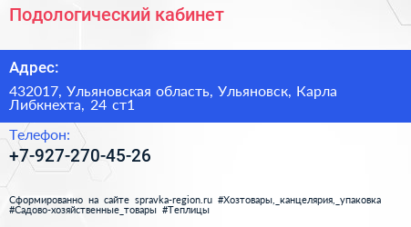 Подологический кабинет по адресу 432017, Ульяновская область, Ульяновск, Карла Либкнехта, 24 ст1 в дальнейшем Организация, размещена в следующих категориях: