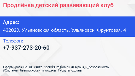 Продлёнка, детский развивающий клуб по адресу 432029, Ульяновская область, Ульяновск, Фруктовая, 4 в дальнейшем Организация, размещена в следующих категориях: