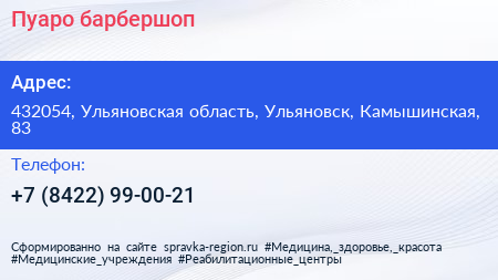 Пуаро, барбершоп по адресу 432054, Ульяновская область, Ульяновск, Камышинская, 83 в дальнейшем Организация, размещена в следующих категориях: