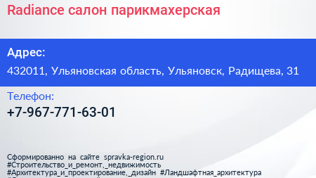 Radiance, салон-парикмахерская по адресу 432011, Ульяновская область, Ульяновск, Радищева, 31 в дальнейшем Организация, размещена в следующих категориях: