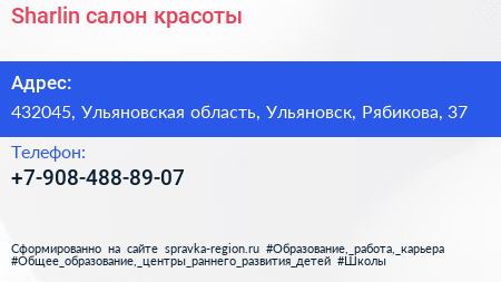 Sharlin, салон красоты по адресу 432045, Ульяновская область, Ульяновск, Рябикова, 37 в дальнейшем Организация, размещена в следующих категориях: