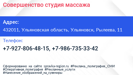Совершенство, студия массажа по адресу 432011, Ульяновская область, Ульяновск, Рылеева, 11 в дальнейшем Организация, размещена в следующих категориях: