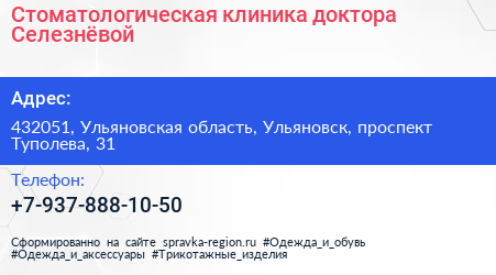 Стоматологическая клиника доктора Селезнёвой по адресу 432051, Ульяновская область, Ульяновск, проспект Туполева, 31 в дальнейшем Организация, размещена в следующих категориях: