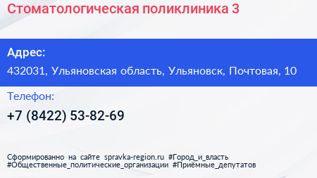 Стоматологическая поликлиника №3 по адресу 432031, Ульяновская область, Ульяновск, Почтовая, 10 в дальнейшем Организация, размещена в следующих категориях:
