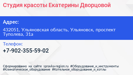 Студия красоты Екатерины Дворцовой по адресу 432051, Ульяновская область, Ульяновск, проспект Туполева, 31а в дальнейшем Организация, размещена в следующих категориях: