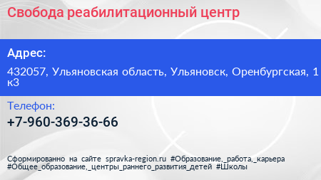 Свобода, реабилитационный центр по адресу 432057, Ульяновская область, Ульяновск, Оренбургская, 1 к3 в дальнейшем Организация, размещена в следующих категориях: