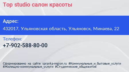 Top studio, салон красоты по адресу 432017, Ульяновская область, Ульяновск, Минаева, 22 в дальнейшем Организация, размещена в следующих категориях: