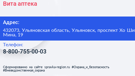Вита, аптека по адресу 432073, Ульяновская область, Ульяновск, проспект Хо Ши Мина, 19 в дальнейшем Организация, размещена в следующих категориях: