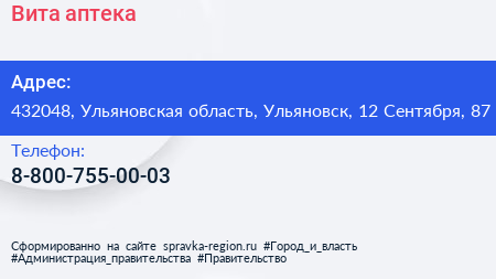 Вита, аптека по адресу 432048, Ульяновская область, Ульяновск, 12 Сентября, 87 в дальнейшем Организация, размещена в следующих категориях: