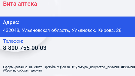 Вита, аптека по адресу 432048, Ульяновская область, Ульяновск, Кирова, 28 в дальнейшем Организация, размещена в следующих категориях: