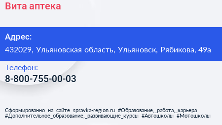 Вита, аптека по адресу 432029, Ульяновская область, Ульяновск, Рябикова, 49а в дальнейшем Организация, размещена в следующих категориях: