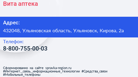 Вита, аптека по адресу 432048, Ульяновская область, Ульяновск, Кирова, 2а в дальнейшем Организация, размещена в следующих категориях: