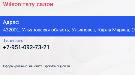 Wilson, тату-салон по адресу 432001, Ульяновская область, Ульяновск, Карла Маркса, 19 в дальнейшем Организация, размещена в следующих категориях: