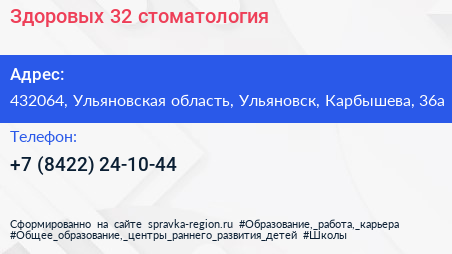 Здоровых 32, стоматология по адресу 432064, Ульяновская область, Ульяновск, Карбышева, 36а в дальнейшем Организация, размещена в следующих категориях: