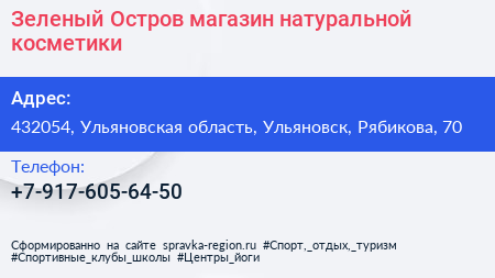 Зеленый Остров, магазин натуральной косметики по адресу 432054, Ульяновская область, Ульяновск, Рябикова, 70 в дальнейшем Организация, размещена в следующих категориях: