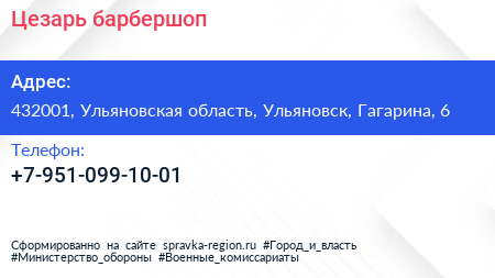 Цезарь, барбершоп по адресу 432001, Ульяновская область, Ульяновск, Гагарина, 6 в дальнейшем Организация, размещена в следующих категориях: