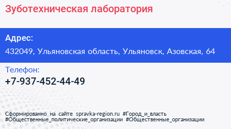 Зуботехническая лаборатория по адресу 432049, Ульяновская область, Ульяновск, Азовская, 64 в дальнейшем Организация, размещена в следующих категориях: