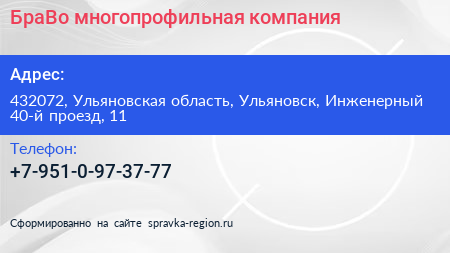 БраВо, многопрофильная компания по адресу 432072, Ульяновская область, Ульяновск, Инженерный 40-й проезд, 11 в дальнейшем Организация, размещена в следующих категориях: