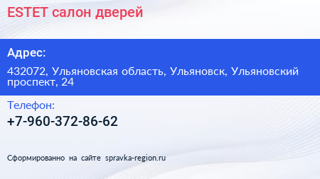 ESTET, салон дверей по адресу 432072, Ульяновская область, Ульяновск, Ульяновский проспект, 24 в дальнейшем Организация, размещена в следующих категориях: