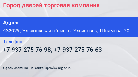 Город дверей, торговая компания по адресу 432029, Ульяновская область, Ульяновск, Шолмова, 20 в дальнейшем Организация, размещена в следующих категориях: