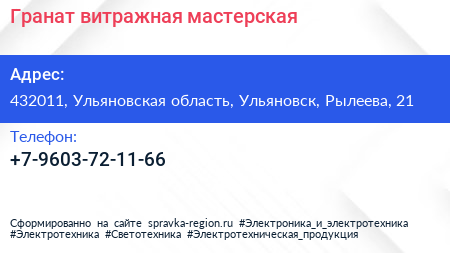Гранат, витражная мастерская по адресу 432011, Ульяновская область, Ульяновск, Рылеева, 21 в дальнейшем Организация, размещена в следующих категориях: