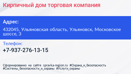 Кирпичный дом, торговая компания по адресу 432045, Ульяновская область, Ульяновск, Московское шоссе, 3 в дальнейшем Организация, размещена в следующих категориях: