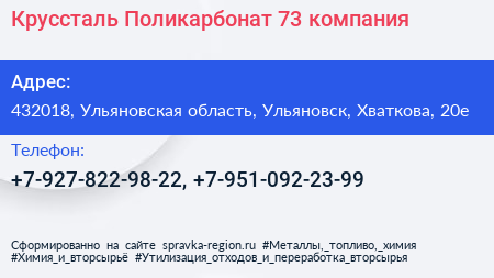 Круссталь Поликарбонат 73, компания по адресу 432018, Ульяновская область, Ульяновск, Хваткова, 20е в дальнейшем Организация, размещена в следующих категориях: