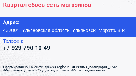Квартал обоев, сеть магазинов по адресу 432001, Ульяновская область, Ульяновск, Марата, 8 к1 в дальнейшем Организация, размещена в следующих категориях:
