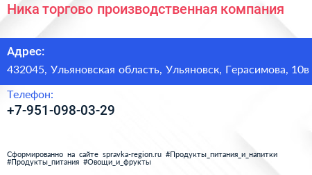 Ника, торгово-производственная компания по адресу 432045, Ульяновская область, Ульяновск, Герасимова, 10в в дальнейшем Организация, размещена в следующих категориях: