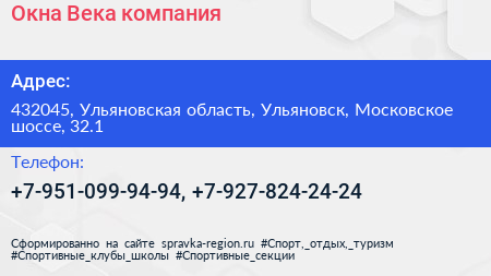 Окна Века, компания по адресу 432045, Ульяновская область, Ульяновск, Московское шоссе, 32.1 в дальнейшем Организация, размещена в следующих категориях: