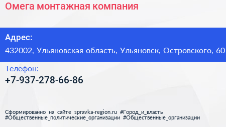 Омега, монтажная компания по адресу 432002, Ульяновская область, Ульяновск, Островского, 60 в дальнейшем Организация, размещена в следующих категориях: