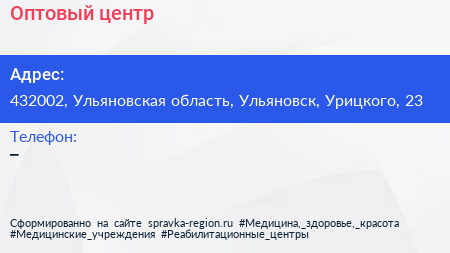 Оптовый центр по адресу 432002, Ульяновская область, Ульяновск, Урицкого, 23 в дальнейшем Организация, размещена в следующих категориях: