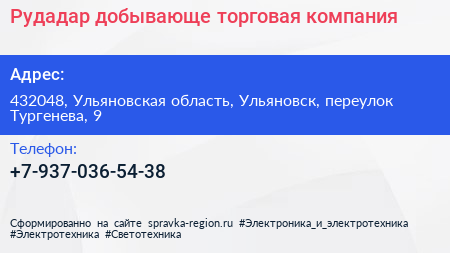 Рудадар, добывающе-торговая компания по адресу 432048, Ульяновская область, Ульяновск, переулок Тургенева, 9 в дальнейшем Организация, размещена в следующих категориях: