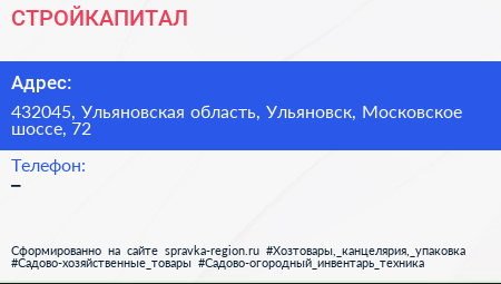 СТРОЙКАПИТАЛ по адресу 432045, Ульяновская область, Ульяновск, Московское шоссе, 72 в дальнейшем Организация, размещена в следующих категориях: