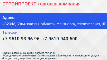 СТРОЙПРОЕКТ, торговая компания по адресу 432046, Ульяновская область, Ульяновск, Мелекесская, 4Б в дальнейшем Организация, размещена в следующих категориях: