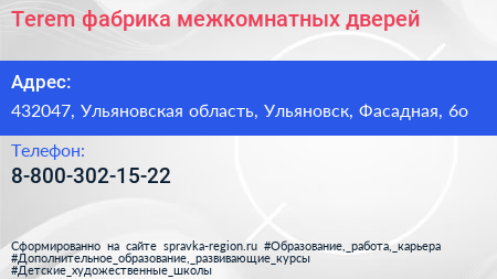 Terem, фабрика межкомнатных дверей по адресу 432047, Ульяновская область, Ульяновск, Фасадная, 6о в дальнейшем Организация, размещена в следующих категориях:
