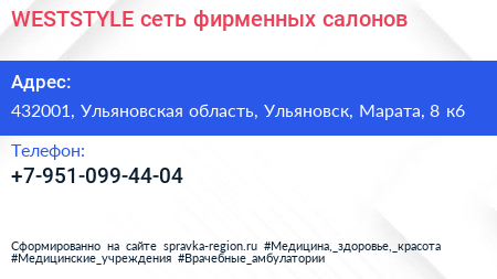 WESTSTYLE, сеть фирменных салонов по адресу 432001, Ульяновская область, Ульяновск, Марата, 8 к6 в дальнейшем Организация, размещена в следующих категориях: